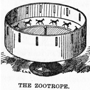 A nineteenth century novelty device that exploited the phi phenomenon and the persistence of vision principle to create the illusion of movement when strips of sequential drawings were placed inside a rotating drum and viewed through a series of slits in the side of the drum. Often thought of as a forerunner of modern motion-picture animation.